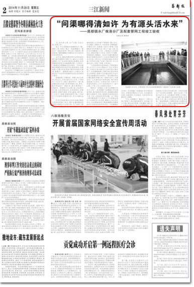 根據(jù)地委、行署的統(tǒng)一部署,項(xiàng)目總投資1.93億元,日供水量3萬立方米,于2013年7月4日正式開工建設(shè),建設(shè)凈水廠1座,配套建設(shè)取水壩及120米管架橋1座,取水、輸水管道總廠39023米,配水管網(wǎng)總廠22140米。修建綜合辦公樓1座,水處理車間1座,以及變配電間、反沖洗泵房、加氯加藥間、絮凝平流池、V型過濾池、清水池、門衛(wèi)室大門圍墻、附屬設(shè)施等工程,于2014年7月20日完成所有建設(shè)內(nèi)容,并正式通水運(yùn)行。