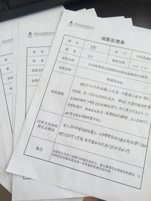 2015年8月22日,為紀(jì)念反法西斯戰(zhàn)爭勝利70周年,宏業(yè)公司組織全體員工進(jìn)行了一次革命傳統(tǒng)教育活動,觀看了電影《鐵道游擊隊(duì)》,一同回顧了那段血淚鑄成的抗戰(zhàn)史,共同緬懷先烈們的英靈。