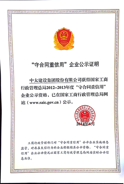 國家工商總局從歷年來各地政府或工商行政管理部門公示的“守合同重信用”企業(yè)中,選出社會誠信度、美譽度高的企業(yè)作為2012-2013年度“守合同重信用”企業(yè)向社會公示,并發(fā)出公告。中太建設集團獲得2012-2013年度“守合同重信用”企業(yè)公示資格。