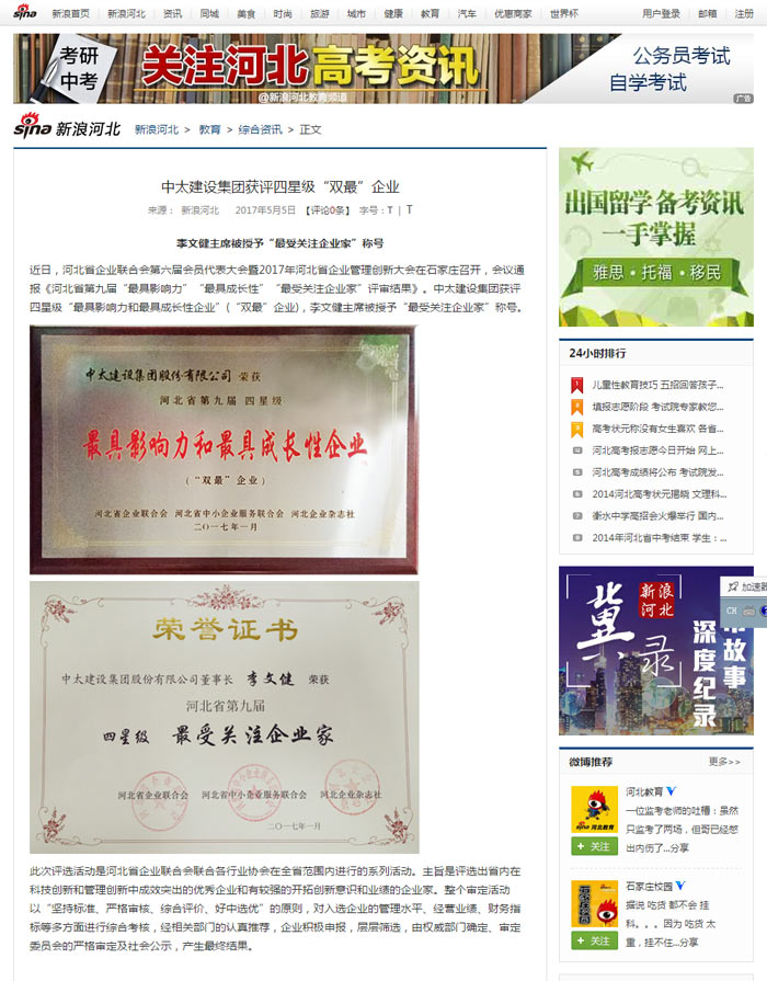 新浪網報道了“中太建設集團獲評四星級“雙最”企業(yè)”