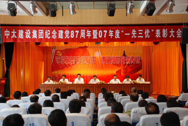 為了傳承黨的光榮傳統(tǒng),激勵士氣、鼓舞干勁,進一步動員全體黨員職工,以中共中央總書記、國家主席、中央軍委主席胡錦濤同志視察集團公司為動力,把當(dāng)前抗震救災(zāi)凝聚出來的力量和精神,運用到實際工作中,轉(zhuǎn)化為推動企業(yè)向前發(fā)展的強大動力,團結(jié)一致、攜手并進,為全面完成好年初公司既定的各項任務(wù)指標(biāo)、實現(xiàn)集團公司又好又快的發(fā)展而努力奮斗。6月28日上午,中太建設(shè)集團黨委在中太大廈二樓報告廳召開紀(jì)念中國共產(chǎn)黨成立八十七周年暨07年度“一先三優(yōu)”表彰大會。集團黨委班子成員,受表彰的“一先三優(yōu)”先進集體代表與優(yōu)秀個人,集團公司總部,三個事業(yè)部全體黨員與全體員工,各黨支部班子成員與部分黨員、入黨積極分子共計200多人參加了表彰會。中太建設(shè)集團公司黨委副書記、監(jiān)事會主席鐘崇鶴主持會議,集團公司黨委委員、總裁張明禮宣讀了表彰的先進黨支部、優(yōu)秀共產(chǎn)黨員、優(yōu)秀黨務(wù)工作者、優(yōu)秀黨小組長名單,集團黨委書記、董事局主席李文健作了重要講話,。