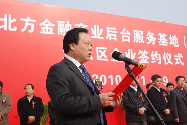 11月19日,經(jīng)河北省人民政府批準(zhǔn),河北省“中國北方金融產(chǎn)業(yè)后臺(tái)服務(wù)基地(A區(qū))”在中太現(xiàn)代服務(wù)業(yè)基地正式掛牌。省長助理、省金融辦主任江波、廊坊市市委書記趙世洪出席揭牌及入?yún)^(qū)項(xiàng)目簽約儀式并為基地揭牌。市長王愛民講話。市政府常務(wù)副市長吳立方、市委常委、組織部長范永錄等省市縣相關(guān)部門領(lǐng)導(dǎo)出席儀式。揭牌儀式由永清縣委書記布澤文主持。