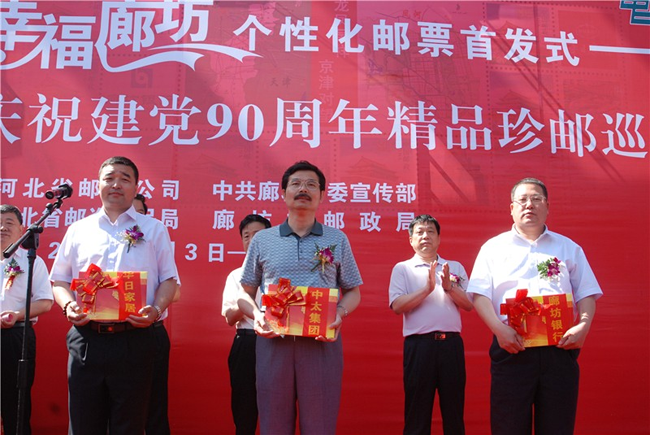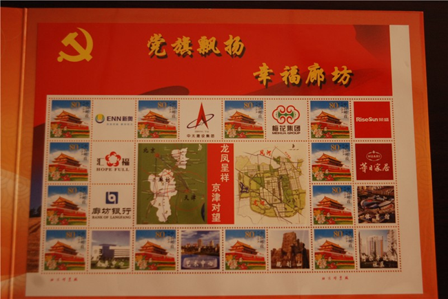 6月3日上午,由廊坊市委宣傳部與廊坊市郵政局共同推出的《黨旗飄揚 幸福廊坊》個性化郵票在廊坊市博物館舉行首發(fā)式。《黨旗飄揚·幸福廊坊》個性化郵票共“1+12”幅圖案。“1”即中心主圖案,體現(xiàn)廊坊市“龍鳳呈祥,京津?qū)ν钡膮^(qū)位優(yōu)勢,“12”即12幅輔圖,其中4幅分別為會展中心、居民小區(qū)、文化藝術中心、中央生態(tài)城,體現(xiàn)“智能、生態(tài)、商務、休閑”的廊坊