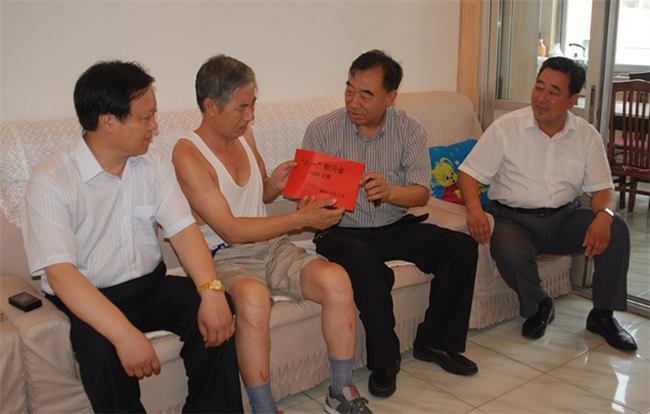 在八一建軍節(jié)到臨之際,7月27日上午,廊坊市人大副主任、市總工會(huì)主席王瑞峰(右二)、廊坊市總工會(huì)黨組書記、常務(wù)副主席關(guān)景發(fā)(右一),市總工會(huì)副主席王泰山在廊坊市建設(shè)局黨委委員、系統(tǒng)工會(huì)主任王克峰等領(lǐng)導(dǎo)同志的陪同下,來(lái)到集團(tuán)公司第一生活區(qū)家屬院,看望慰問(wèn)公司因病家庭困難的軍轉(zhuǎn)干部劉國(guó)清(左二),代表市總工會(huì)向劉國(guó)清表示節(jié)日慰問(wèn),并頒發(fā)了慰問(wèn)金。中太建設(shè)集團(tuán)黨委書記、董事局主席李文。ㄗ笠唬┡阃繂(wèn)。 |