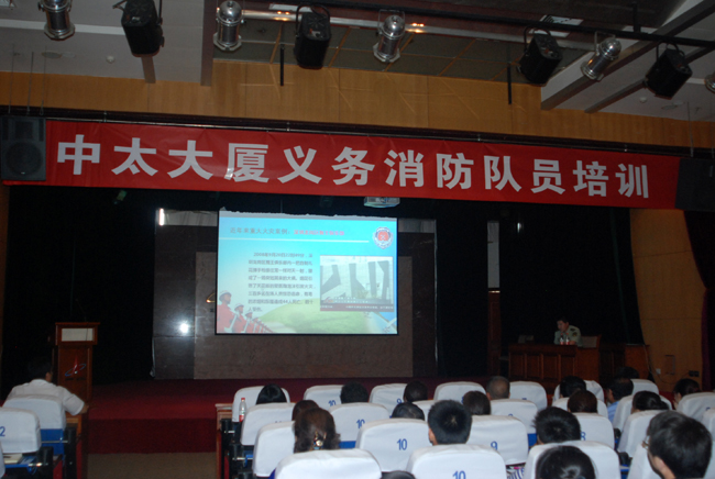 此次培訓(xùn)由市消防支隊(duì)遲楊科長(zhǎng)親自授課,大廈共有二十二個(gè)單位近百人參加,中太建設(shè)集團(tuán)領(lǐng)導(dǎo)高度重視大廈的消防工作,總裁張明禮同志親臨現(xiàn)場(chǎng)并致辭。培訓(xùn)過(guò)程中,遲科長(zhǎng)首先從火災(zāi)的視頻案例、如何提高四個(gè)能力建設(shè)、如何對(duì)寫(xiě)字樓開(kāi)展防火巡查及消防設(shè)施設(shè)備的維護(hù)等方面進(jìn)行了詳細(xì)細(xì)致的講解,緊接著從貼近生活、實(shí)用性強(qiáng)的消防常識(shí)入手,講解了火災(zāi)的預(yù)防、報(bào)警、撲救、滅火器的使用方法、人員疏散及逃生十三決。