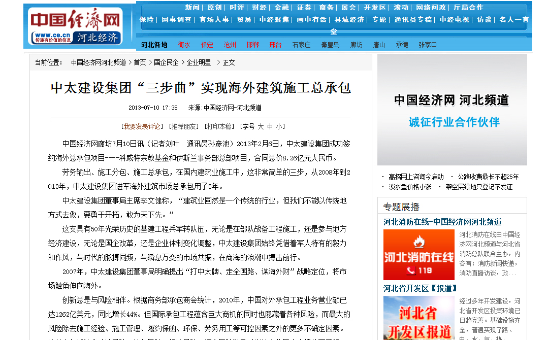 中國(guó)經(jīng)濟(jì)網(wǎng)報(bào)道了中太建設(shè)集團(tuán)“三步曲”實(shí)現(xiàn)海外建筑施工總承包 |