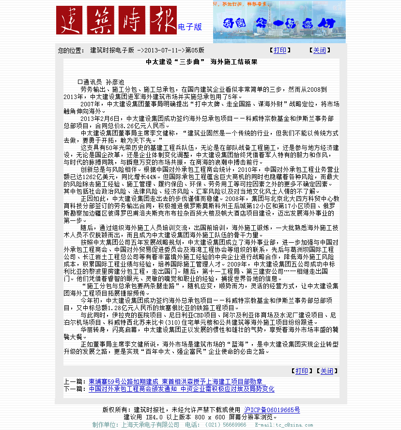 《建筑時報》7月11日第五版報道了中太建設(shè)集團(tuán)進(jìn)軍海外市場結(jié)碩果
