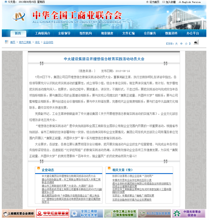 全國(guó)工商聯(lián)網(wǎng)站8月14日?qǐng)?bào)道了中太建設(shè)集團(tuán)召開(kāi)理想信念教育實(shí)踐活動(dòng)動(dòng)員大會(huì) |