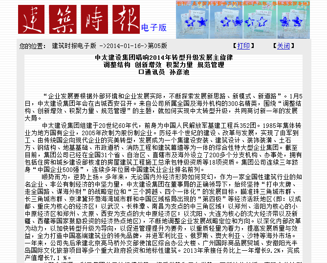 建筑時(shí)報(bào)2014年1月16日?qǐng)?bào)道了中太建設(shè)集團(tuán)唱響2014年轉(zhuǎn)型升級(jí)發(fā)展主旋律