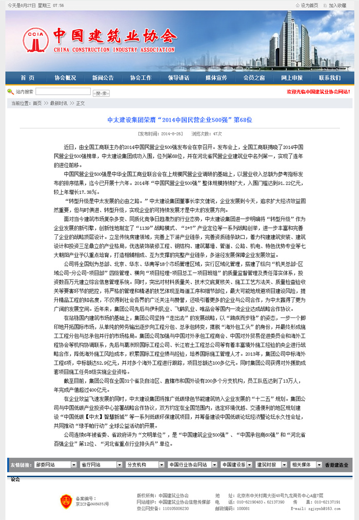 中國建筑業(yè)協(xié)會報道了中太建設集團榮膺“2014中國民營企業(yè)500強”第68位