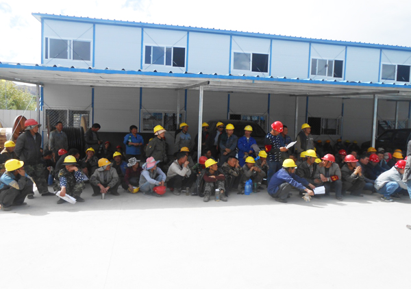 為了不影響現(xiàn)場施工,這次教育活動被安排在午休時間。烈陽高照,數(shù)百名工人整齊地排坐在拉薩指揮部大院,接受項目經(jīng)理高進來的安全知識培訓(xùn)。培訓(xùn)過程中,高經(jīng)理首先親自示范了佩戴安全帽的正確方法,并講解了“安全三寶”的重要性,從“安全意識”到“三不傷害”,從“臨邊洞口防護”到“用火用電”,從“特殊工種”到“塔吊等大型機械”,最后也講到了生活區(qū)安全管理和環(huán)境衛(wèi)生。高經(jīng)理從廣大職工切身利益的角度出發(fā),對一線安全生產(chǎn)須知進行了生動形象的描述。隨后,安全部負(fù)責(zé)人王子成針對施工現(xiàn)場的薄弱環(huán)節(jié)和安全隱患,也向現(xiàn)場工人提出了若干點安全要求,引起了在場工人的高度重視。